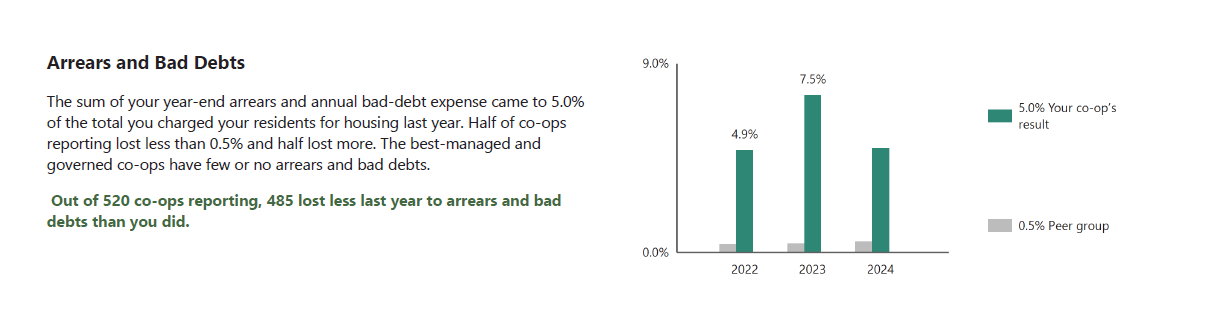 Using data from our clients’ Annual Information Returns (AIR), the report presents a co-operative’s three-year trends on such metrics as vacancy loss, arrears, capital reserve contributions, administrative spending, energy costs and more. Even better, the data is shared visually on bar graphs as well as text to view each co-op’s results compared against those of other co-ops.